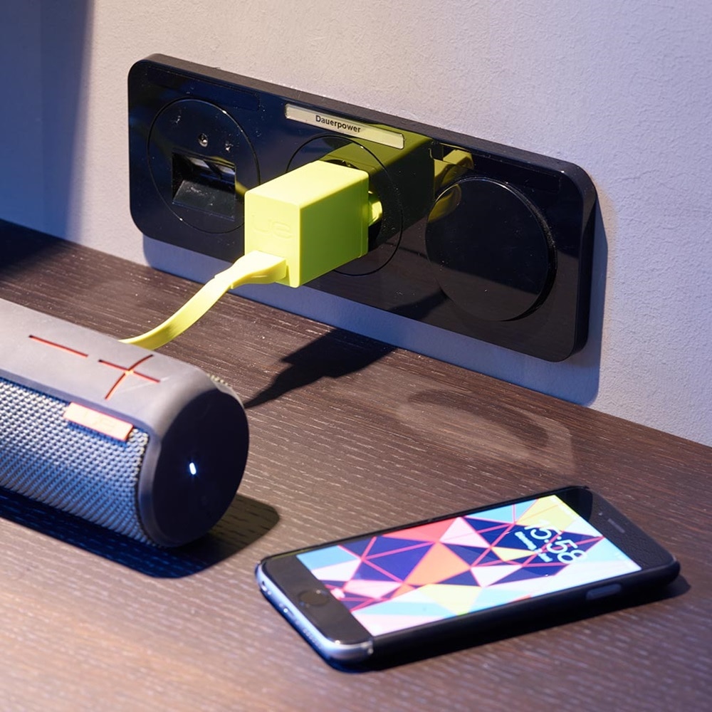 Beschriftungsfelder im Blendrahmen ermöglichen die klare Zuordnung der Einsätze, wie zum Beispiel: Dauerstrom. So weiß der Gast immer, an welcher Steckdose er sein Handy zu jeder Zeit laden kann. Über die Manufaktur bietet Berker die Möglichkeit, nicht benötigte Beschriftungsfelder mit Blinddeckeln im Material der Blende nahezu unsichtbar zu verschließen.