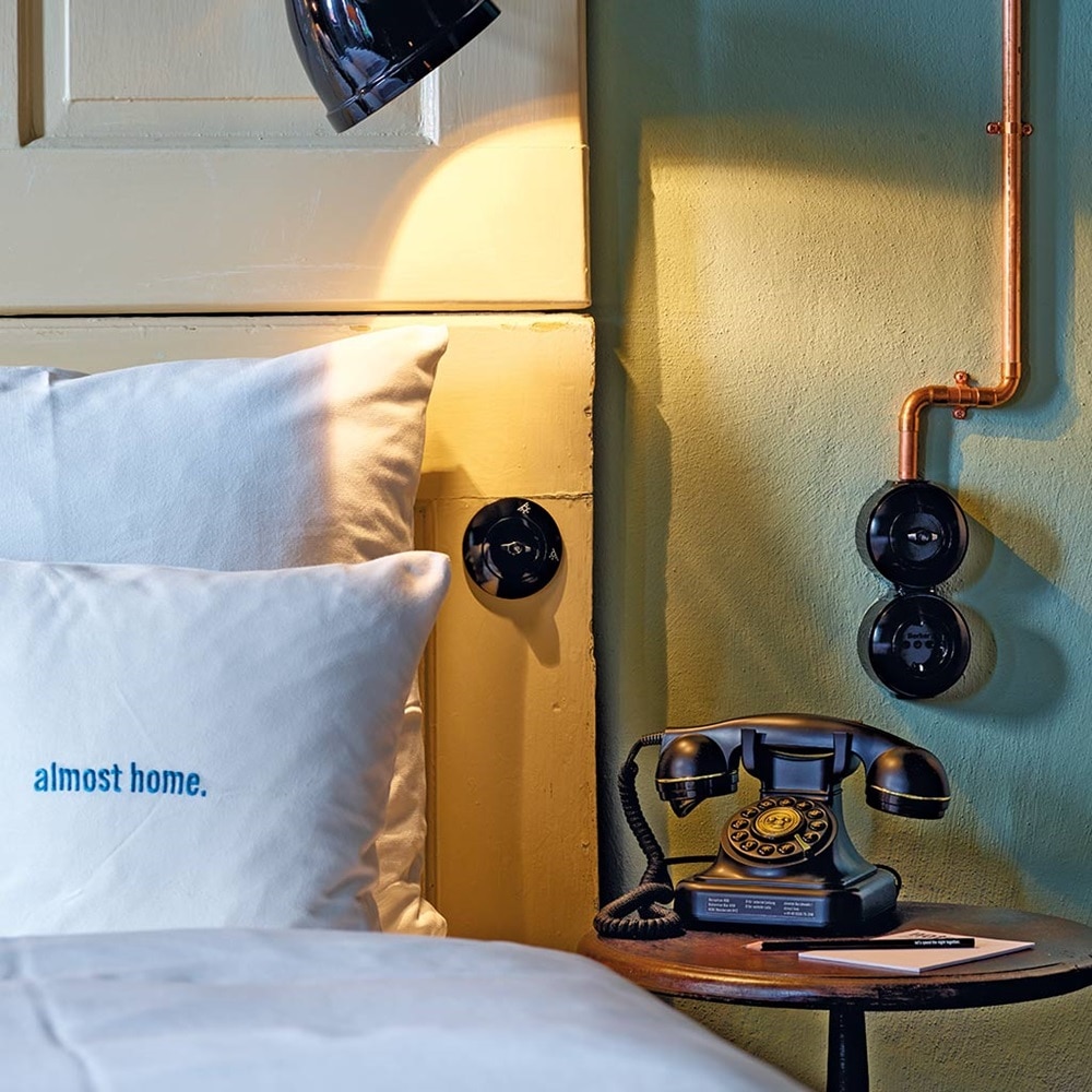 Schalter im Retrodesign, Aufputz-Installationen aus Kupferrohren und alte Türen als Bettrückwand, werden frech kombiniert mit modernen Sitzgarnituren. Der geschichtliche Dialog der HafenCity findet so in den Zimmern seine Miniaturabbildung. Ob auf oder unter dem Putz – die Berker Serie 1930 bietet immer etwas fürs Auge. Und auch die inneren Werte überzeugen: Modernste Schalttechnik im Inneren der Schalter bietet vielfältige Funktionen, bis hin zur KNX-Anbindung.