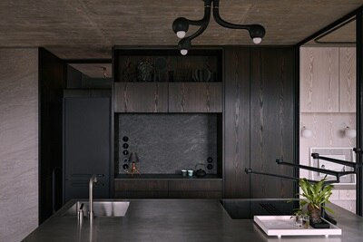 Janine und Mark Seelen, Bewohner des obersten Bunker-Stockwerks, entschieden sich für eine Kombination der nackten brutalistischen Hülle mit intelligentem Innenausbau und feinsten Materialien. Kern ihres 83 Quadratmeter-Lofts ist eine hölzerne Insel, die Bad und WC, Kühlschrank, Versorgungsleitungen und begehbaren Kleiderschrank birgt. Der große Rest des Raumes umfließt wie ein U-förmiges Kontinuum vom Eingangsbereich über Ess- und Wohnzimmer bis zur Küche. Das Schalterprogramm Berker R.classic bildet dabei mit seinen runden Konturen einen idealen Gegenpol zur hart-nüchternen Hülle des Apartments.