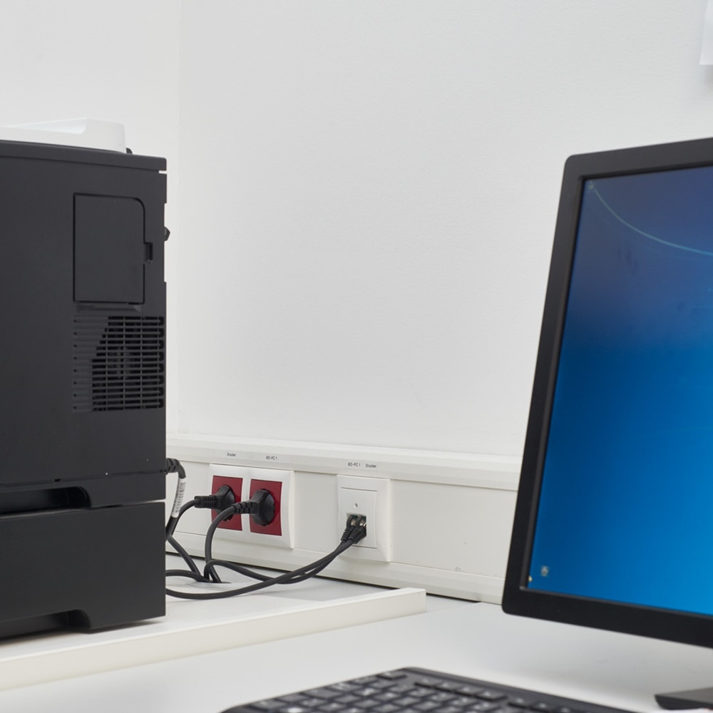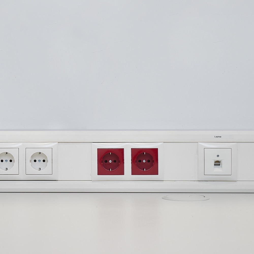 Das Brüstungskanalsystem tehalit BRN zeichnet sich durch zeitsparende Montage, einfaches Nachinstallieren und robustes Material aus. Es gewährleistet eine sichere Leitungsführung und variablen Geräteeinbau. Hier wurde es mit Komponenten aus dem Schalterprogramm Berker S.1 bestückt.