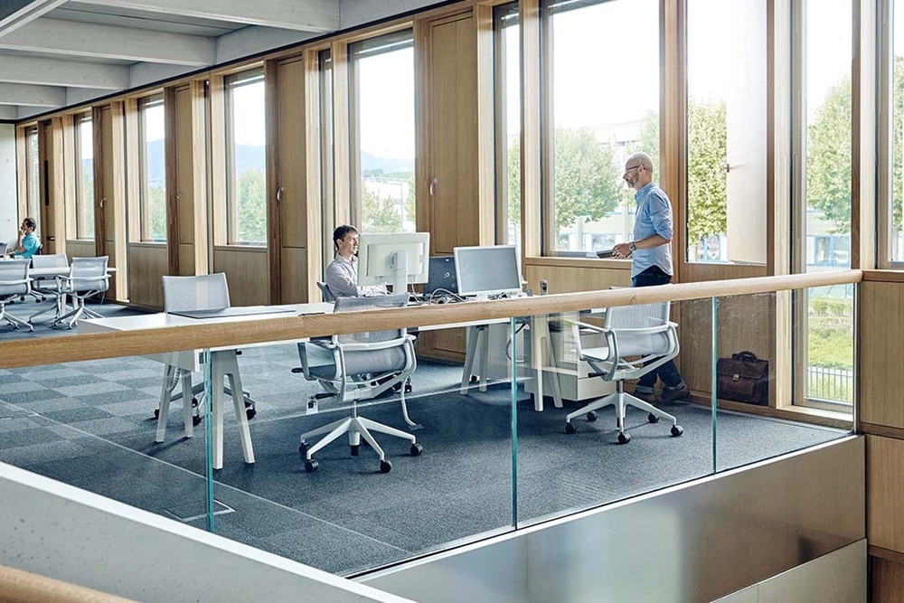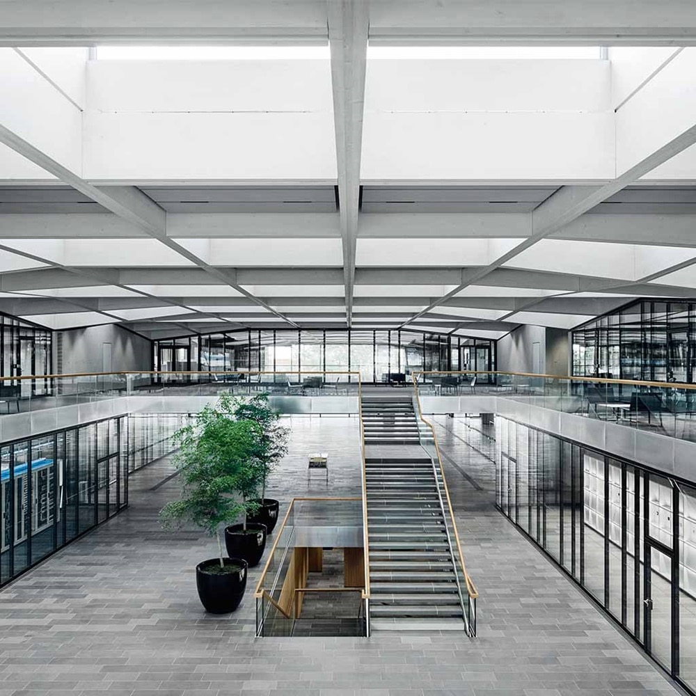 Anstelle eines prätentiösen Unternehmens-Statements entwarfen die Architekten einen dezenten H-förmigen Gebäuderiegel aus Holz und Glas, der auf jede große Geste verzichtet. Augenfälligstes Merkmal ist ein 108 mal 39 Meter großes hölzernes Dachtragwerk aus Brettschichtholz, das zum Firmentor weisend weit über die Gebäudekubatur hinausragt – eine Art architektonischer Willkommensgruß gegenüber Besuchern.