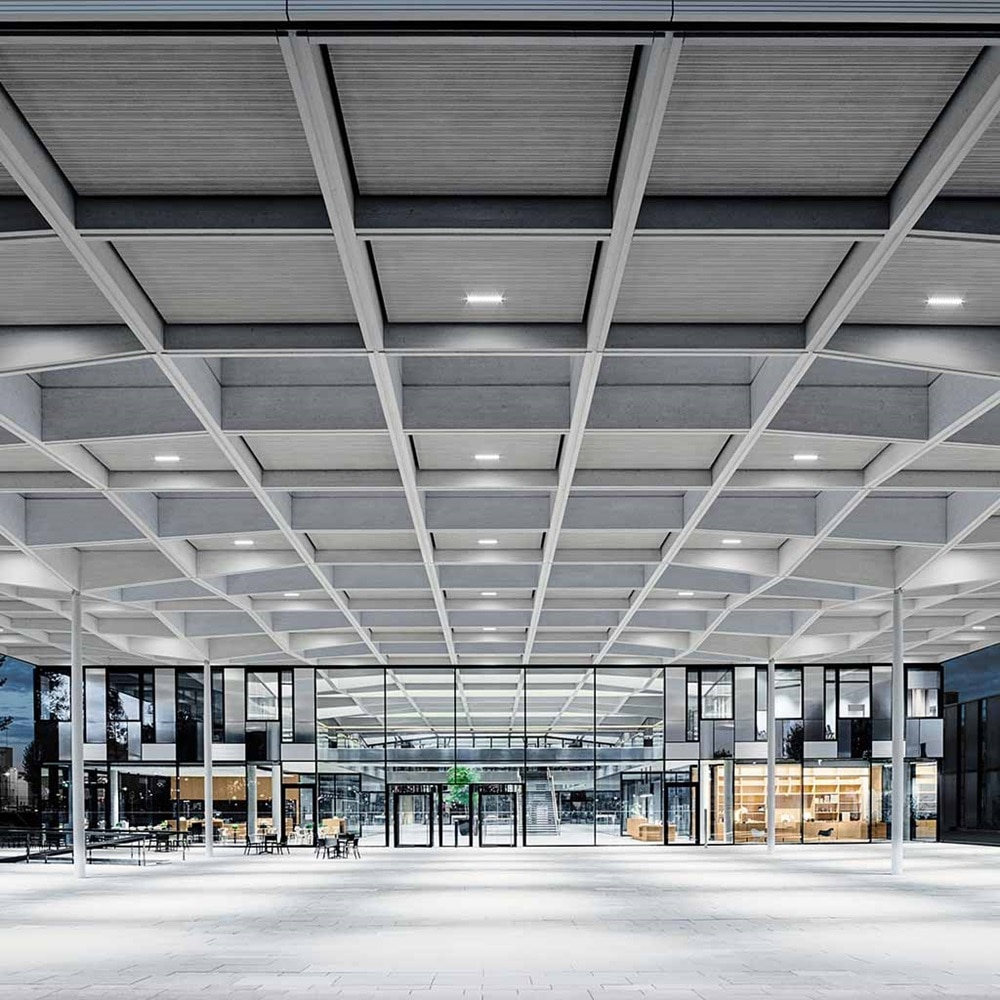 Im Inneren befindet sich neben Showrooms, Büros, Tagungs- und Projekträumen vor allem die zentrale Eventfläche „The Hub“, die vom südlichen Gebäudeteil durch eine Brücke getrennt wird. Für sie entwickelten Sauerbruch Hutton Architects gemeinsam mit Werner Sobek Ingenieure eine anspruchsvolle Lösung aus der Brückenbautechnik. Dank vorgespannter Monolitze kann die Atriumbrücke aus Beton jetzt 21 Meter stützenfrei überspannen – und öffnet den Blick weit durchs Atrium.