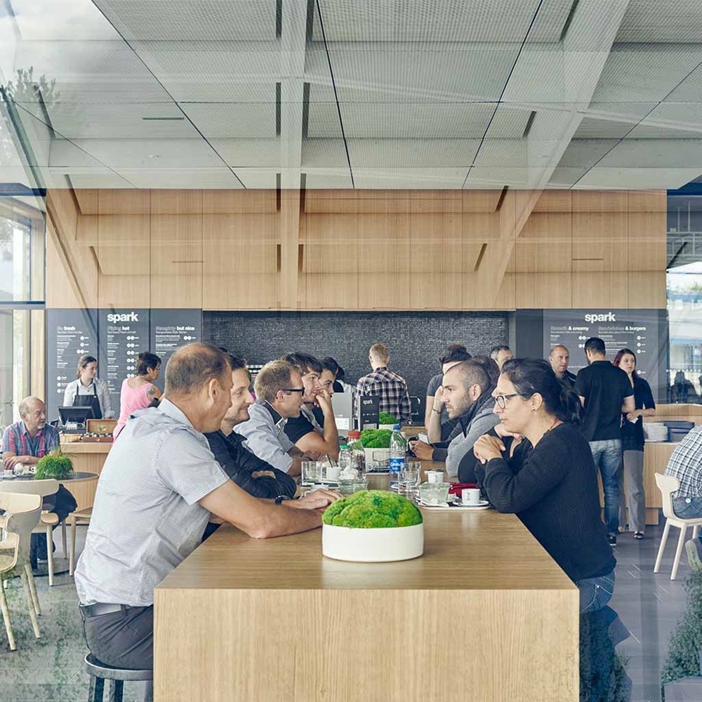 Das Café „The Spark“ gleich vis-à-vis des Eingangs ist weit mehr als eine gut ausgestattete Besucherkantine, es ist nämlich Treffpunkt, Ruhezone, Co-Working-Space und Projektraum in einem. Neben Getränken und Speisen sollen hier künftig kontinuierlich Ideen und Kontakte ausgetauscht, After-Work-Sessions und Brainstormings veranstaltet werden. Es ist ein Ort, an dem – wie es der Name verrät – künftig buchstäblich der Funke überspringen wird.