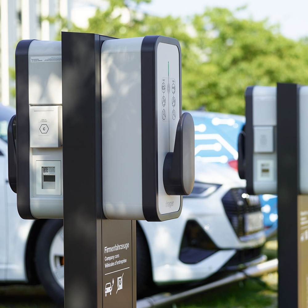 Beim Planungsbüro ITG in Eching kommen witty share Wallboxen, intelligentes Lastmanagement und Energieverteilung aus einer Hager Hand. Dank unserer Ladelösung laden bei dem Unternehmen Elektroautos und Plug-in-Hybride nachhaltig mit PV-Strom direkt vom Parkplatzdach.