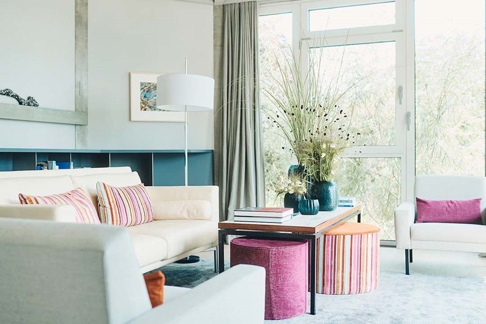 Das entscheidende Element aber ist das Farbkonzept mit Naturpigmentfarben, mit dem Grundies das 100 qm-Objekt grundlegend aufwertet. Dabei wird aus dem Sechziger Jahre-Bau keine Villa Kunterbunt, im Gegenteil: „Ein architektonisch gelungenes Farbkonzept ist eines, das der Betrachter gar nicht bewusst wahrnimmt, dessen Wirkung er emotional aber umso mehr spürt“, meint die Designerin. „Es tritt in einen Dialog mit Umgebung, Licht und Architektur, hebt das Positive hervor und lässt das weniger Positive zurücktreten.“
