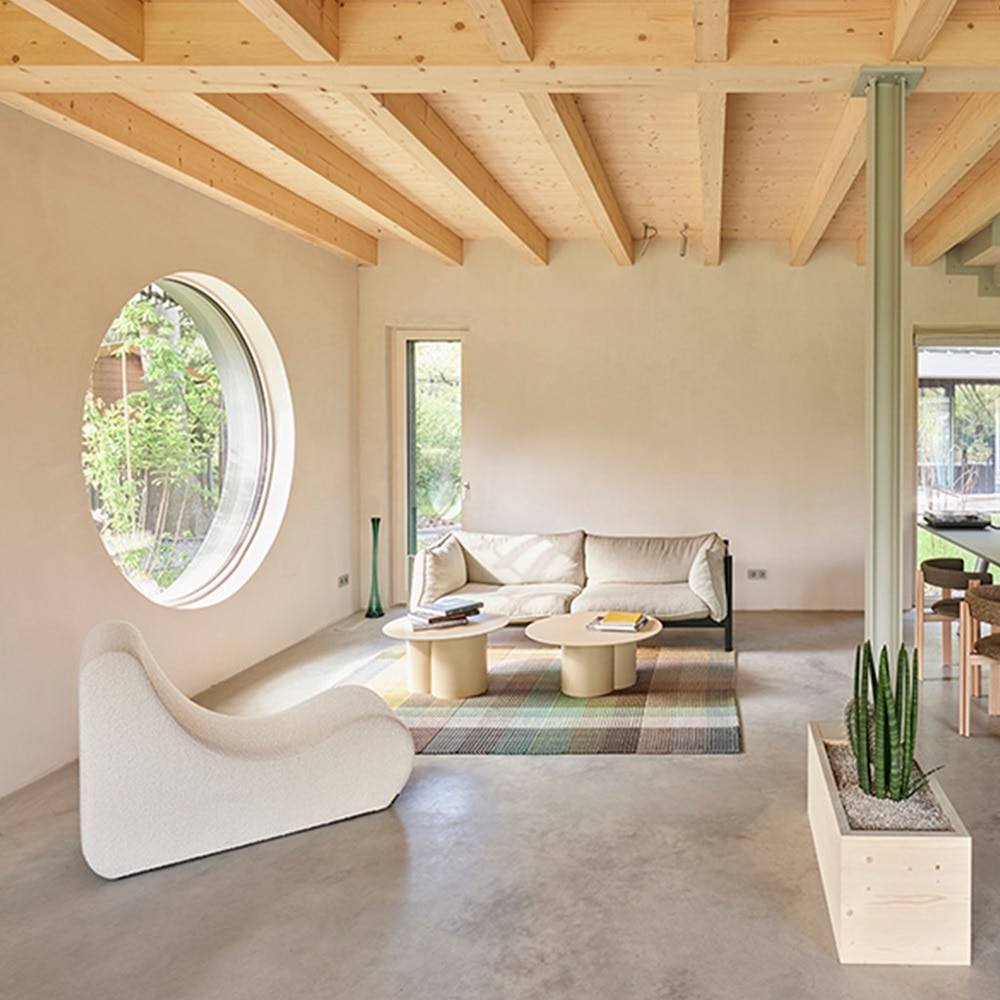 Wichtige Weichen in puncto Nachhaltigkeit stellte der Architekt und Bauherr schon durch Materialauswahl und Gebäudezuschnitt. Das Wandmaterial seines Hauses ist Fichtenholz, das von einer Südtiroler Zimmerei in Form 120 mm dicken Brettschichtelementen vorgefertigt sowie von Holzwolledämmung und einem Innenputz aus Lehm ergänzt wird. Ein zwei Meter auskragendes Holz-/Stahl-Dach schützt die Fassade im Winter vor Feuchtigkeit und das Hausinnere im Sommer vor Sonneneinstrahlung und Aufheizung. Eine Regenwasserzisterne und die Dachbegrünung auf dem Haupthaus schonen die lokalen Ressourcen, während eine Photovoltaikanlage auf den Nebengebäuden klimafreundliche Elektrizität erzeugt.