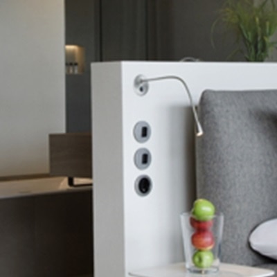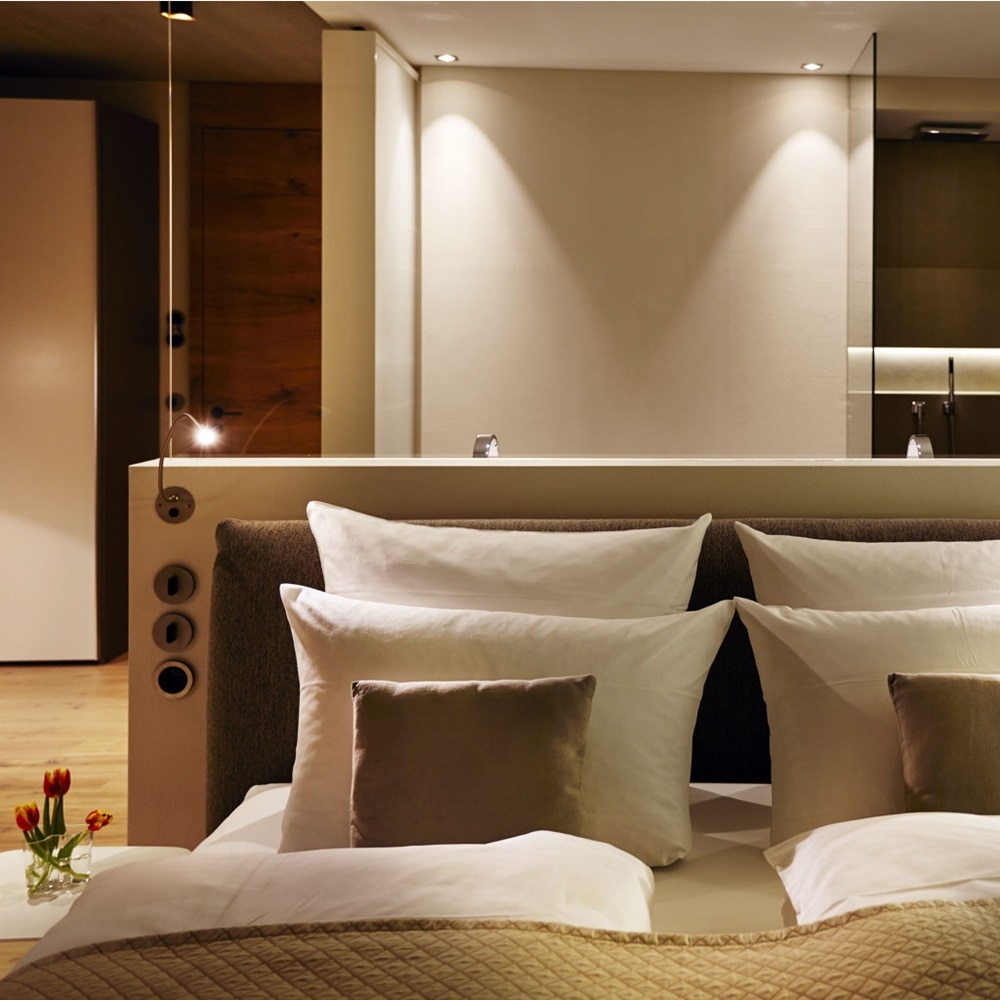 Über den Hotelcard-Schalter wird passend zur Tageszeit die jeweilige Lichtstimmung aktiviert. Eine kurze Nachlaufzeit beim Ziehen der Karte verhindert, dass der Gast „im Dunkeln steht“. Im passenden Design gibt es auch einen Raumtemperaturregler.