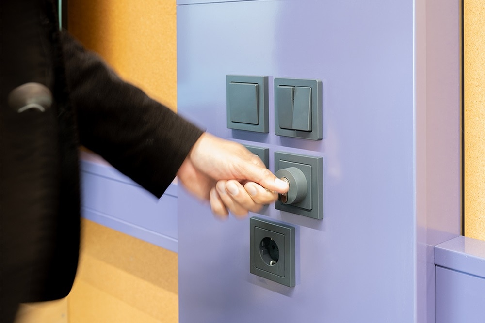 Das mit einem Architekturpreis ausgezeichnete Farbkonzept des Klassenraums erforderte auch die farbliche Anpassung der sichtbaren Teile der Elektroinstallation – umgesetzt von der Hager Manufaktur in der Sonderfarbe RAL 14012 (Perlbrombeer).