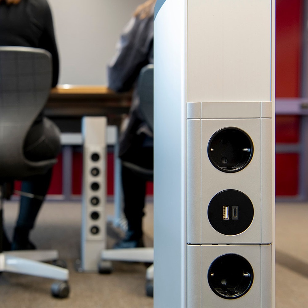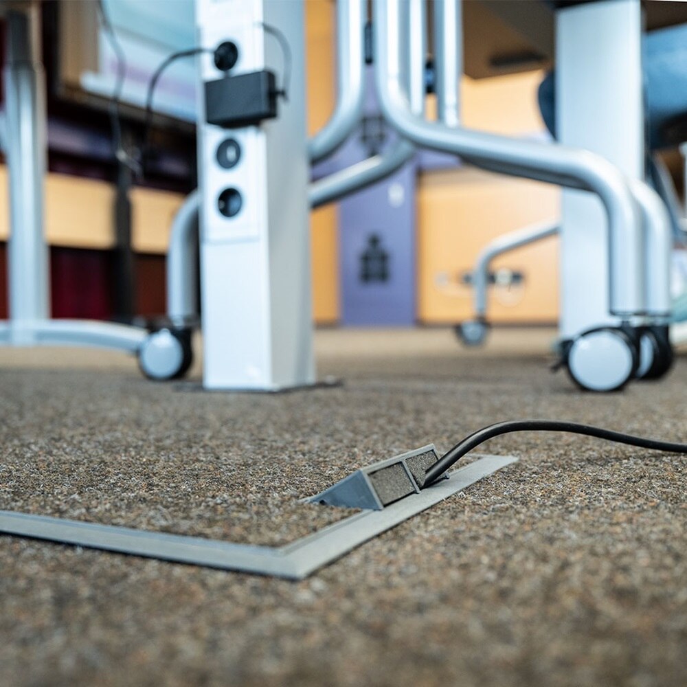 Für die Versorgung des Lehrerpults und der mittig im Raum platzierten Schülertische mit Energie- und Datenanschlüssen sorgen die Bodenanschlusssäulen tehalit DAP. Durch die dezentrale Bereitstellung der benötigten Anschlusstechnik inklusive Lademöglichkeit für mobile Endgeräte direkt am Platz werden Stolperfallen durch auf dem Boden liegende Kabel vermieden.
