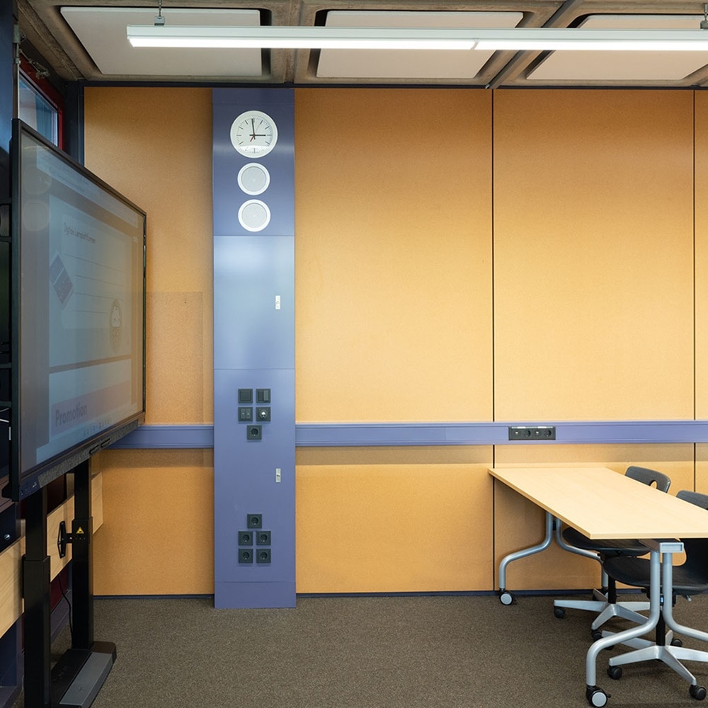 In der Mediensäule laufen alle Strom- und Datenleitungen und auch die Steuereinheiten für Jalousien und Licht zusammen. Darüber hinaus ist die Mediensäule mit einer Hager Unterverteilung inklusive Schalt-, Schutz- und Steuergeräten sowie einer Uhr und einem Lautsprechersystem für Durchsagen ausgestattet.