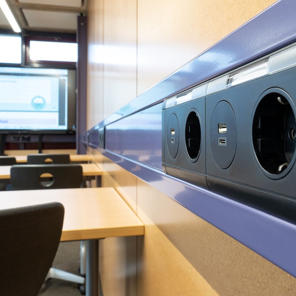 Die Versorgung der wandnahen Schülertische mit Energie- und Datenanschlüssen übernimmt der Brüstungskanal tehalit BRS aus robustem Stahlblech. Die integrierte Kanalsteckdose-SCHUKO® USB mit USB-A- und USB-C-Anschlüssen macht eine aufwändige und alljährliche TÜV-Prüfung der Steckernetzteile mitgebrachter Endgeräte überflüssig.