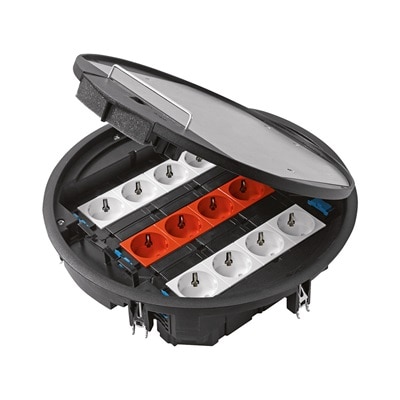 electraplan Versorgungseinheiten von Hager mit Steckdosen und Multimedia-Anschlüssen sorgen für eine komfortable Energieverteilung. Sie fügen sich harmonisch in den Boden ein. In die Abdeckung wird der jeweilige Bodenbelag, in diesem Falle Parkett, eingeklebt, so dass auch ein homogener optischer Eindruck entsteht.