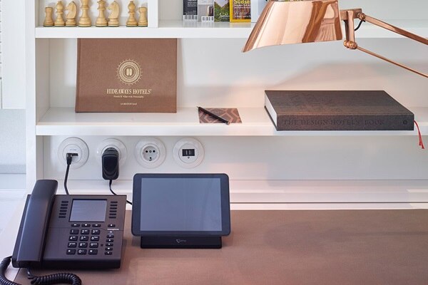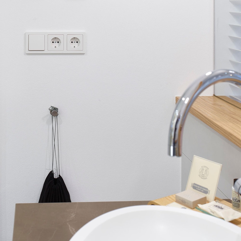 Sprung in eine andere Zeit: Im Neubautrakt des LA MAISON hotels gelingt mit dem Schalterprogramm Berker Q.1 in polarweiß durch seine weichen, abgerundeten Konturen und das plane Profil der Sprung in die Moderne.