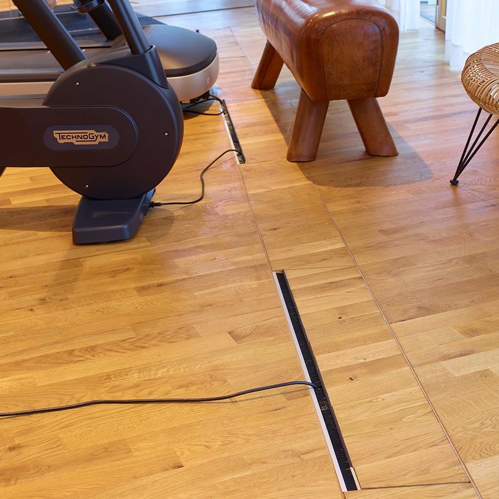 Unsichtbare Anschlusstechnik: Die Oberteile des tehalit BKB im Fitnessraum sind passend zum Boden mit Parkett belegt. Darunter verbergen sich Geräteeinbauten wie zum Beispiel Doppelsteckdosen zur Energieversorgung der Trainingsgeräte.