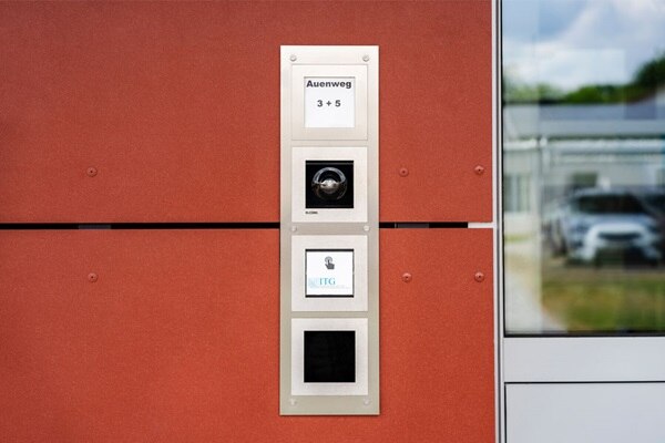 Die Elcom Audio-/Video Türsprechanlage aus hochwertigem Edelstahl signalisiert bereits im Eingangsbereich den hohen technischen Anspruch des Neubaus. Hinter der elegant designten Frontplatte ohne sichtbare Verschraubung verbirgt sich die einfach zu installierende 2Draht-Technik.