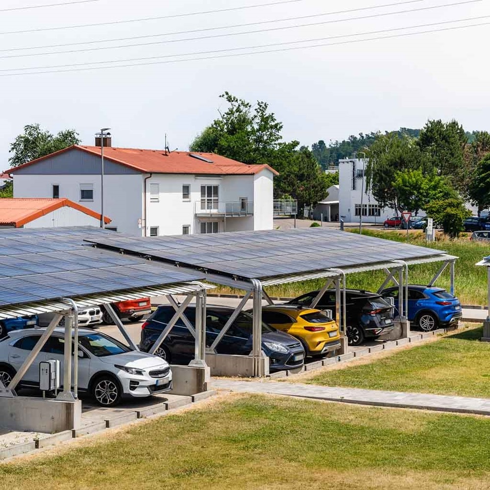 Die großflächige Photovoltaik-Anlage wurde als Parkplatzüberdachung umgesetzt. Damit verbindet sie die ökologische Stromerzeugung mit dem Schutz der Fahrzeuge vor Witterungseinflüssen.