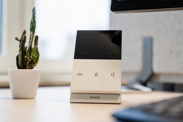 Die Innenstation Elcom touch Video ist in einer Tischkonsole platziert, die sich im Sekretariat befindet. So ist vom Schreibtisch aus erkennbar, wer vor der Tür steht.
