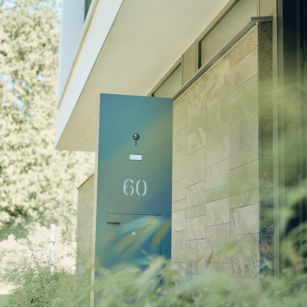 Die individuell maßgefertigte Elcom Steele aus der Hager Manufaktur ist perfekt auf das architektonische Konzept des Hauses abgestimmt und empfängt die Besucher an der Grundstücksgrenze des einzigartigen Architektenhauses. Die Briefkastensäule aus Edelstahl mit einer Höhe von 2,30 m kombiniert minimalistisches Design mit ausgeklügelter Technik. So sorgt beispielsweise ein temperaturgesteuertes Kameramodul mit kratzfester Abdeckung inklusive Heizung bei jedem Wetter für klare Sicht.
