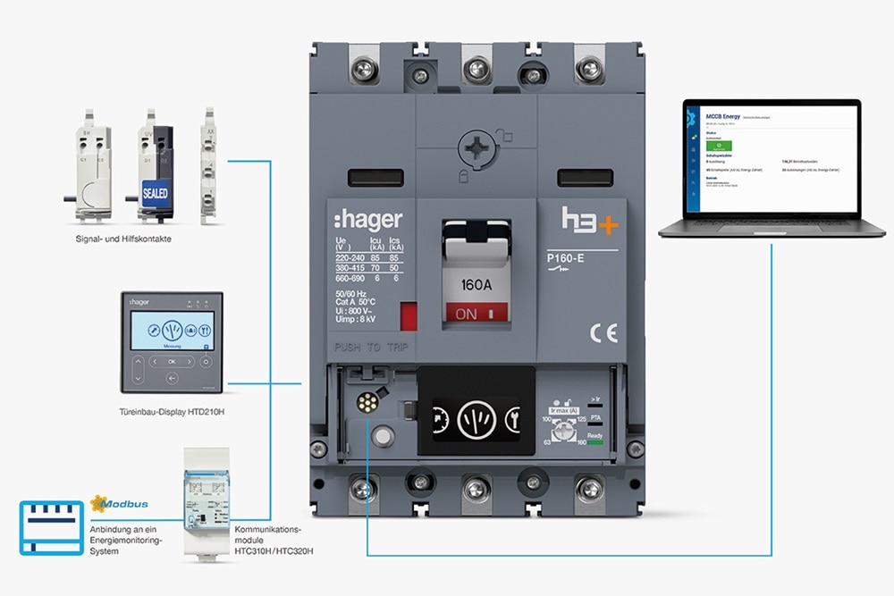 Mit der Größe eines Gebäudes wächst nicht nur der Energiebedarf. Es steigen auch die Anforderungen an die Schutzeinrichtungen. Die Leistungsschalter h3+ werden ihnen mehr als gerecht – mit 3 Baugrößen und über 300 Gerätevarianten. Mit seiner kompakten Bauform und Nennströmen von 25 bis 630 A in 3- und 4-poliger Ausführung bietet der h3+ mit einem Abschaltvermögen von bis zu 110 kA eine hohe Schutzleistung. Das erhöht die Anlagenverfügbarkeit, ohne die Betriebssicherheit zu beeinträchtigen. Durch passende Zusatz-Bausteine lassen sich alle Kompaktleistungsschalter h3+ nahtlos in das univers N-System von Hager integrieren.