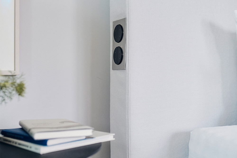 Das sorgt für ein Schalterprogramm, das mit seinen extra flachen Lichtschaltern geringer Aufbauhöhe Wandkonzepte gestattet, die atemberaubend flach sind. Selbst ein nahezu wandbündiger Einbau ist mit einer Dose-in-Dose-Montage möglich. Dazu wird das flache Erscheinungsbild dadurch verstärkt, dass das Steckdosen-Zentralstück bündig mit dem Rahmen abschließt und nicht herausschaut.